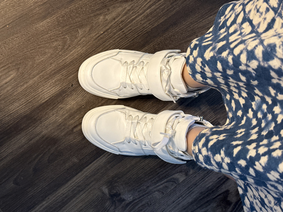 The image displays a first-person, downward-facing perspective of an individual's lower extremities. The subject is wearing a flowing garment, likely a dress or skirt, featuring an abstract, mottled pattern in shades of blue and off-white. The lower portions of the subject's legs are visible above the ankles. The individual is wearing a pair of white high-top sneakers. Each shoe features white laces, a prominent ankle strap with a visible closure mechanism, and a zippered opening on the medial side. The brand name "GOLDEN GOOSE" is faintly discernible on the tongue of the right shoe. The subject is standing on a dark brown floor characterized by a wood grain pattern, with the planks oriented diagonally from the upper left to the lower right of the frame. The exact location within the city of Austin, United States, cannot be determined from the visual information presented.