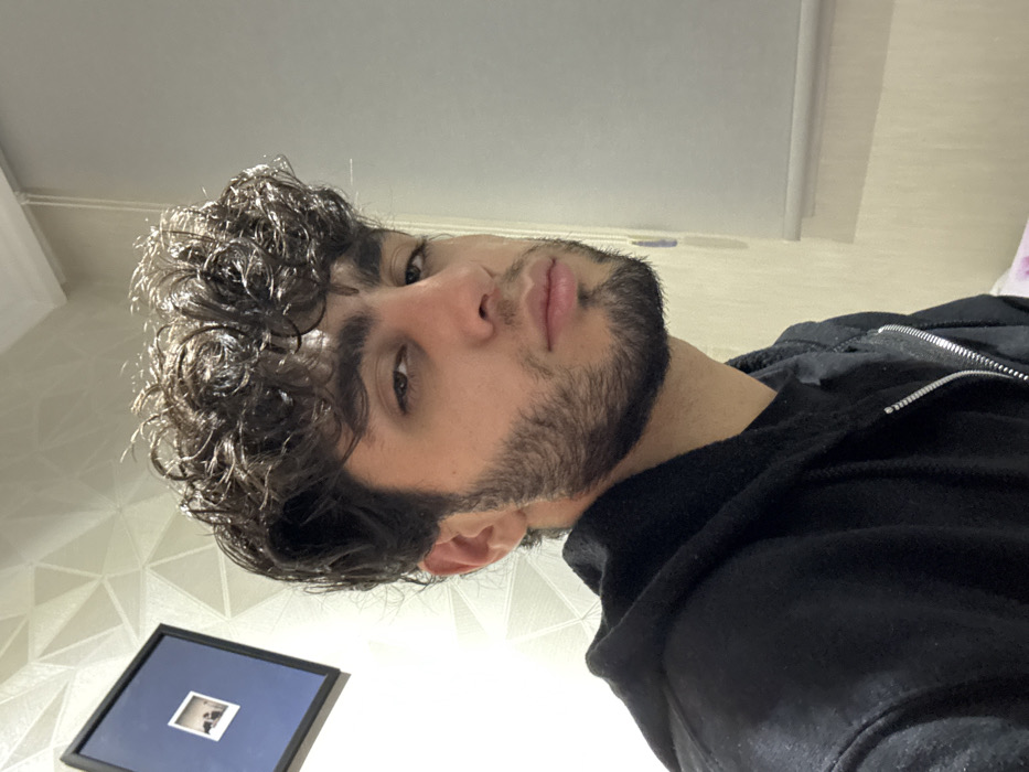 A young man with curly, dark hair and a trimmed beard looks down at the camera. He wears a black hooded sweatshirt with a visible zipper. The background includes a white wall with a geometric pattern and a framed picture. The ceiling is also visible, showing a white surface and a strip light. The camera angle is tilted, giving a perspective from above the subject.