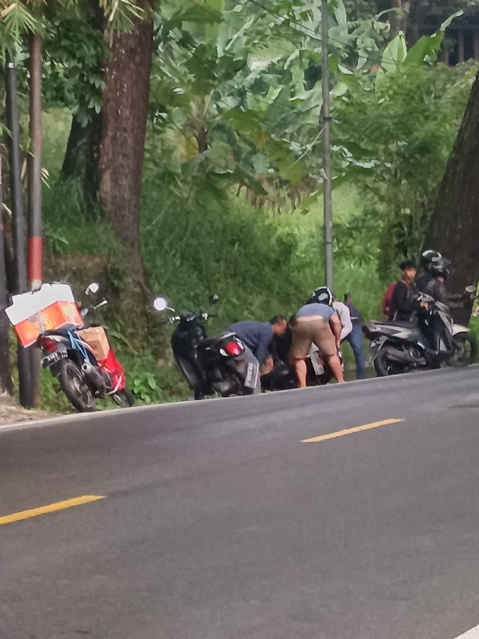 The image depicts a roadside scene in Cijedil, Indonesia. In the foreground, an asphalt road features a solid yellow line on the left and a segmented yellow line to the right. To the left of the road, a red scooter with a large white container and a brown cardboard box strapped to its rear is parked on an incline next to two dark vertical poles. Further right, a group of approximately five to six individuals are gathered. Three individuals are actively bent over, appearing to inspect or work on a black scooter parked by the road. One of these individuals wears a blue shirt, another tan shorts, and a third a white shirt. To their right, two other individuals stand near another black scooter; one wears a dark jacket and helmet, the other a dark top and red backpack. A fourth black scooter is also visible. The background consists of dense, lush green vegetation, including large-leaf plants and trees, suggesting a tropical environment.