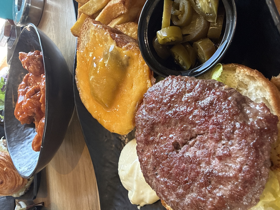 The image displays a close-up, overhead view of multiple food items arranged on a light-colored wooden tabletop, indicating a casual dining setting. In the foreground, a large, seared beef patty rests on the bottom half of a burger bun, with green lettuce visible underneath. Beside it, on a black rectangular plate, is a dollop of white creamy sauce. Adjacent to these, a thick slice of toasted bread is covered with melted, bubbly orange cheese, and a small black ramekin filled with green pickled jalapeño slices. Partially visible behind the cheese-covered bread are golden-brown french fries. In the midground, a black ceramic bowl contains several pieces of chicken coated in a glossy, reddish-orange sauce. The background includes a portion of another meal featuring a croissant-like bun for a sandwich, and a silver cylindrical object, possibly an ashtray or condiment holder. This presentation of items, including the specific food types and plating, is consistent with a location of Boom! Burgers & Steaks in Sofia, Bulgaria.