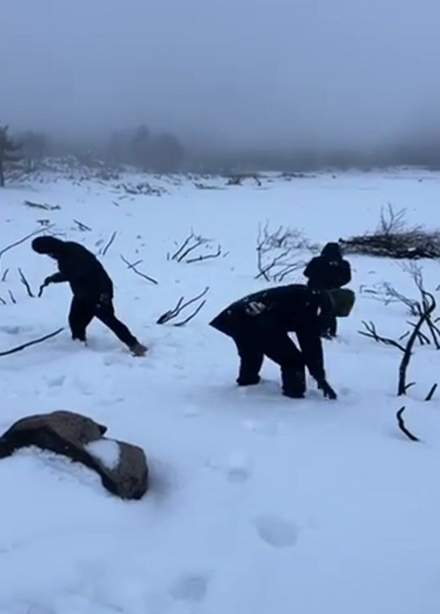 Three people are playing in the snow. The snow is deep, covering the ground and surrounding a frozen lake or pond in the background. Bare branches and a few scattered rocks are visible on the snowy surface. The sky is overcast, and there is fog obscuring the background. One person is bent over, making a snowball. Another person throws a snowball and then raises their arms in anticipation of throwing another. The third person is also making snowballs. They are all wearing dark clothing.