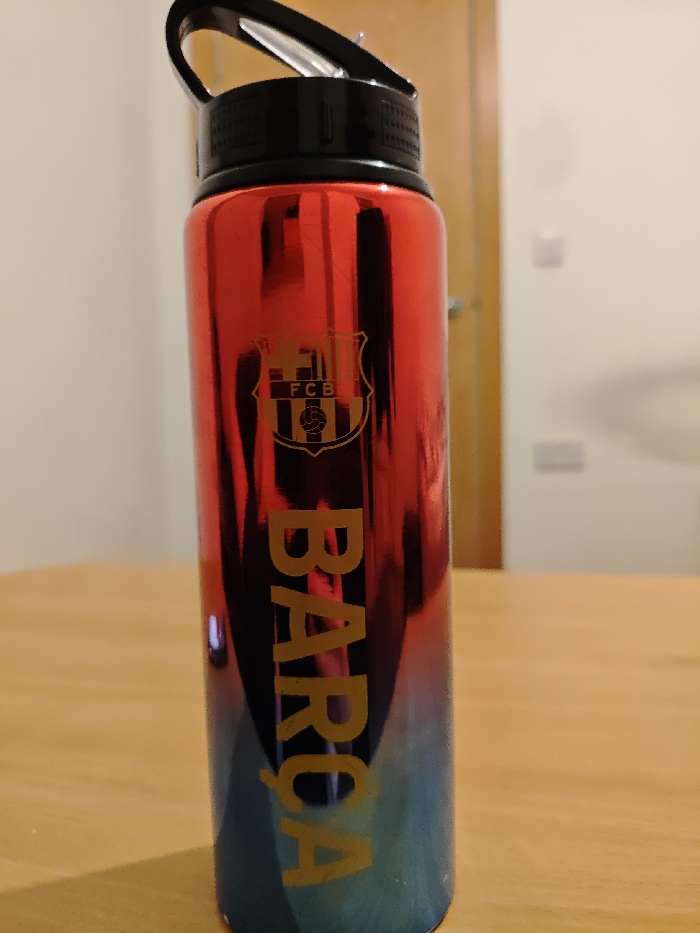 - "A cylindrical, metallic water bottle stands upright on a light-colored wooden table" by FM-5h6EL2, licensed under CC BY 4.0