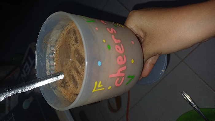 - "The image depicts a close-up, eye-level view of a translucent plastic cup filled with an iced, frothy, light brown beverage, held by a human hand, in an indoor setting in Pintomakmur, Indonesia" by FM-XKDpn2, licensed under CC BY 4.0