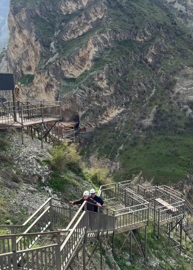 Two people wearing white hard hats stand on a wooden staircase platform with metal railings on a steep mountainside. One person moves down the stairs. The platform is part of a series of similar structures connected by stairs that lead down the slope. In the background, a large rocky mountain dominates the scene, with visible layers and patches of green vegetation. To the left of the stairs, there's a small building and a platform with a rope barrier. The sky is partly cloudy, and the overall setting is outdoors.