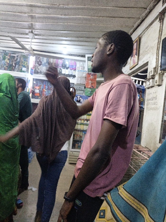 The scene depicts the interior of a commercial establishment in Gwagwarwa, Nigeria. Four individuals are visible. A young adult Black male, positioned in the foreground right, wears a pink short-sleeved t-shirt, dark trousers, and a black wristband. He has short dark hair and light facial stubble, with his head turned towards the left and his mouth slightly open. A blue and yellow patterned fabric partially obscures his lower right side. To his left, a Black female, partially facing away from the camera, wears a brown hijab that covers her head and upper torso, along with blue jeans. Her right arm is raised and extended, holding a white smartphone as if capturing an image, with noticeable motion blur. Partially obscured behind her to the far left is a Black individual in a green full-body garment. Further in the background, another Black male in a dark green shirt is partially visible. The background features white retail shelving units stocked with various merchandise, including packaged items, footwear, and a glass-fronted refrigerator filled with bottled beverages. The ceiling is ribbed and white, with a white three-bladed ceiling fan visible overhead. The right wall features multiple electrical outlets, a framed portrait, and handwritten notes affixed below them. The space is illuminated by overhead light fixtures.