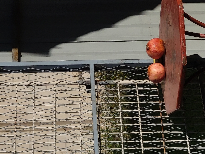 - "The scene, located in Trebinje, Bosnia and Herzegovina, depicts two pomegranates resting on a weathered, reddish-brown octagonal metal table" by FM-ngoIJ3, licensed under CC BY 4.0