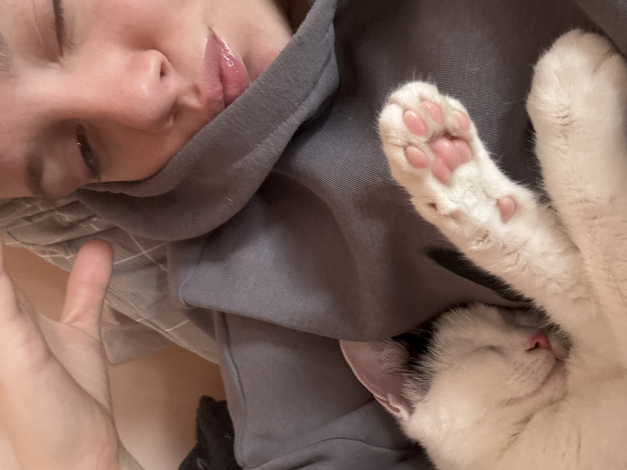 The image presents a close-up, high-angle view of an indoor scene featuring a human and a domestic cat. A person's face, visible from the upper nose to the chin, shows closed eyes and glossy lips, with the right side of the face partially obscured by the grey hood of a garment. The person's left hand is visible in the upper left corner of the frame. A predominantly white domestic cat with a pink nose is curled and asleep, resting against the person's torso. One of the cat's front paws, displaying distinct pink toe pads, is prominently featured. The person is wearing a grey hooded garment, which also partially covers the cat. The background is out of focus, suggesting a soft, indeterminate indoor environment, possibly bedding or a blanket with faint patterns. The scene depicts a state of shared rest or sleep between the human and the cat. No visual information within the image itself identifies the specific location in the city of Sofia, Bulgaria.