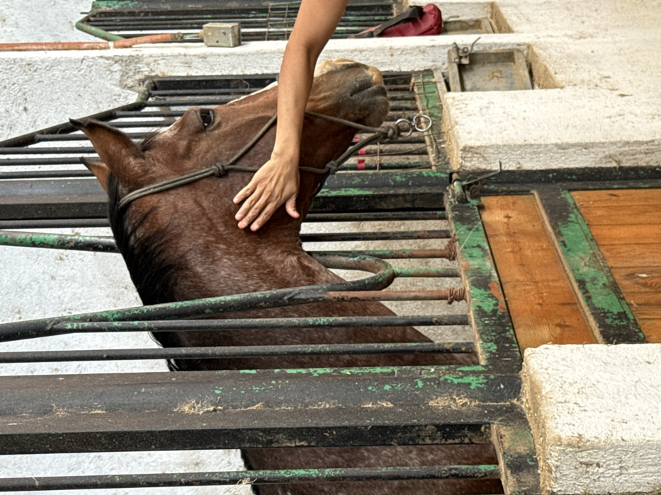 The image depicts a close-up view within a stable in El Paraíso, Mexico. A bay horse, characterized by its reddish-brown coat with dark speckling, a dark mane, and a white blaze on its forehead, is visible behind dark metal bars. The horse wears a olive-green rope halter. A human hand, with light skin, is seen reaching through the bars to gently touch the horse's neck and jawline area. The stable enclosure consists of vertical dark metal bars, some exhibiting chipped green paint and rust, atop a wooden lower gate. The background features light-colored, textured walls, possibly concrete, with an electrical outlet and a red fabric object visible on the right side.