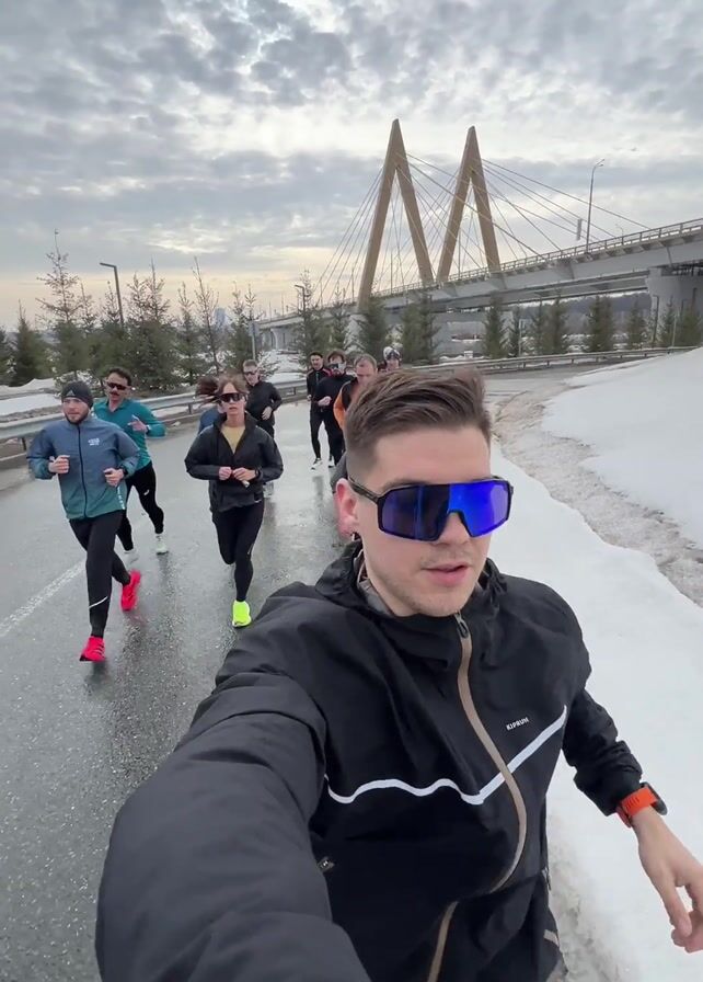 A man wearing blue sunglasses is recording himself with a phone camera while running with a group of about a dozen people on an asphalt path. The weather is overcast with a cloudy sky. There is melting snow on the right side of the path. In the background, a cable-stayed bridge is visible. Most people are wearing athletic clothing suitable for cold weather running.