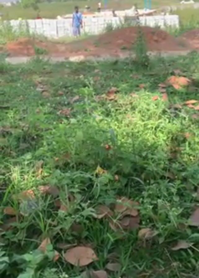 grassy field with some fallen leaves in the foreground. In the background, there is construction underway. Several people are working on what appears to be a foundation made of cinder blocks. A man in a blue shirt is walking in front of the construction site. The sky is overcast and there are trees visible in the far background.