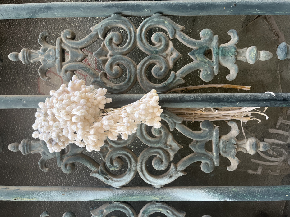 A weathered, ornate metal gate with an intricate swirling pattern is covered in a layer of dust. Resting on the gate is a bundle of creamy white floral stamens, tied together with a small bunch of straw. The gate’s aged blue-green paint is flaking off, revealing the underlying metal. The background is a blurry, frosted glass, hinting at an interior space.
