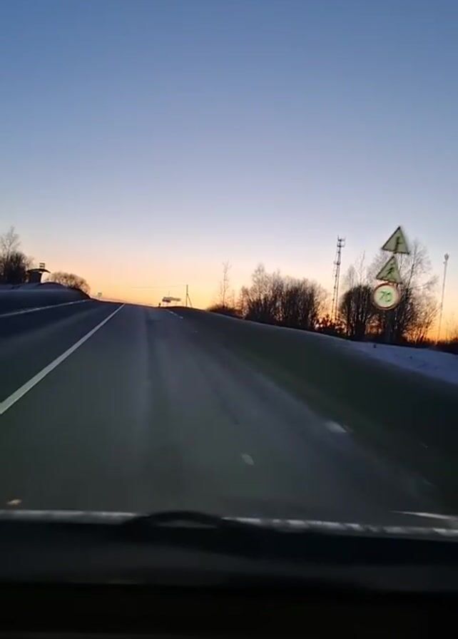 car's perspective driving down a highway, with the sun setting in the distance. The sky is a gradient of blue to orange. A few trees are visible on either side of the road, with some snow on the ground. There is at least one other car on the road ahead. A cell tower and several road signs are visible.