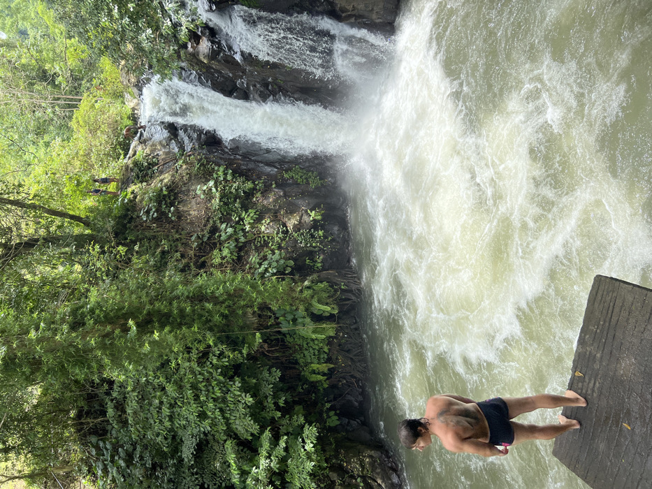 The scene is set in Ambengan, Indonesia, depicting a natural waterfall and swimming area within a dense tropical forest. In the foreground, a shirtless male with dark, wet hair, wearing black swimming trunks with a pink accent, stands barefoot on a rough wooden platform extending over the water. He has a prominent dark tattoo on his upper back and is positioned with his back mostly to the viewer, looking towards the turbulent water below the waterfall. A powerful multi-stream waterfall cascades down dark, rocky formations into a frothy, light-green pool. The rock faces flanking the waterfall are heavily covered in lush green vegetation, including trees, ferns, and vines, with some visible tree roots clinging to the rocks. At the upper edge of the waterfall, near where the water begins its descent, one individual is partially visible, appearing to be in or near the water. Further back and slightly to the left, two additional individuals are standing on a rocky ledge, observing the activity. One wears a blue top and the other a white top. The entire environment is characterized by vibrant green foliage under what appears to be bright daylight.