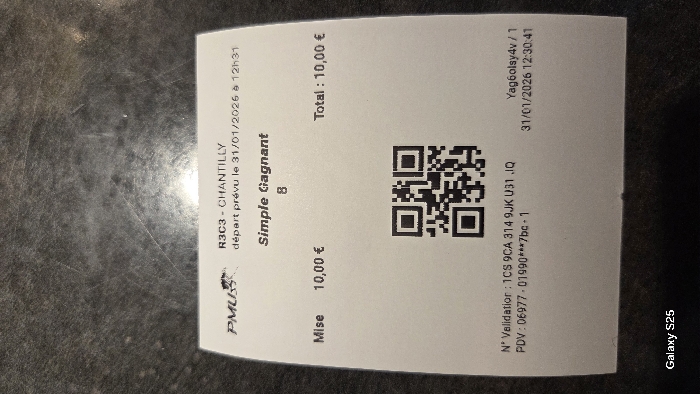 A white paper betting slip, issued by PMU, is centrally positioned on a dark, textured surface. The ticket details a "Simple Gagnant" (Simple Winner) bet for race "R3C3 - CHANTILLY," scheduled for departure on January 31, 2026, at 12:31. The bet is on number 8, with a stake and total of 10.00 €. A QR code is printed below the bet details. The validation number "1CS 9CA 314 9JK U31 IQ" is visible, along with the Point of Sale (PDV) number "06977 - 01990***7bc - 1." The transaction occurred on January 31, 2026, at 12:30:41. The PDV number "06977" corresponds to a PMU point of sale located in Saint-Avold, France, specifically identified as "Tabac Presse FDJ PMU Le Longchamps" at Place de la Victoire. The image, a close-up overhead shot, includes a "Galaxy S25" watermark in the bottom left corner. No individuals are visible.