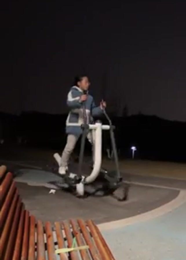 A young girl with glasses is using an outdoor elliptical machine in a park at night