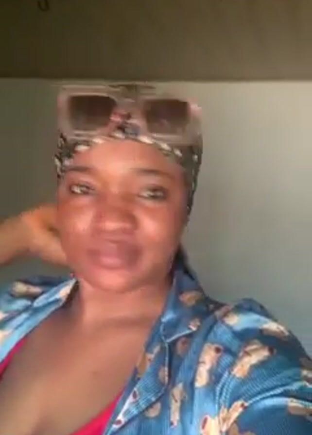 A person with tanned skin, wearing a red top and a blue patterned pajama shirt, stands indoors. They have a headscarf on and sunglasses perched on top. They are moving their head and body slightly. The background is a plain wall.