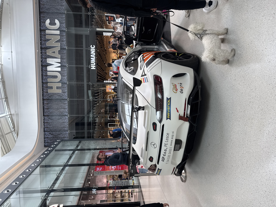 The image captures a white Mercedes-AMG GT race car displayed indoors within the Aleja Shopping Centre in Ljubljana, Slovenia