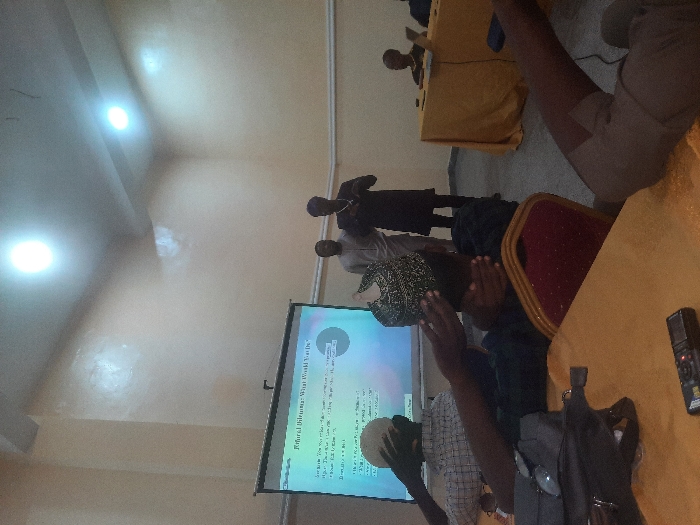 The image depicts an indoor gathering within a large room, presumed to be a conference or lecture hall, located in the city of Unknown, Unknown. The walls are painted a light cream or beige, illuminated by two circular ceiling lights. In the foreground, two individuals are seated with their backs partially facing the camera. The person on the left, wearing a plaid shirt, has their hands covering their head. To their right, another individual, wearing a dark shirt and a patterned cap, also has both hands covering their face. On the yellow-draped table in front of them, a black remote control and a gray bag with eyeglasses are visible. To the far right in the foreground, a pair of legs in light-colored trousers is extended. In the midground, towards the left, a projector screen displays text, prominently showing "Referral Dilemma: What Would You Do?". Standing in front of this screen are two men. The man on the left wears a light-colored traditional garment. The man on the right, dressed in a dark traditional garment and a dark cap, is actively speaking or presenting, with his right arm raised and gesturing. Further to the right in the background, another table draped in yellow fabric is visible, behind which at least one person is seated, observing the ongoing presentation. The room is furnished with chairs featuring red upholstered backs and gold-toned frames.