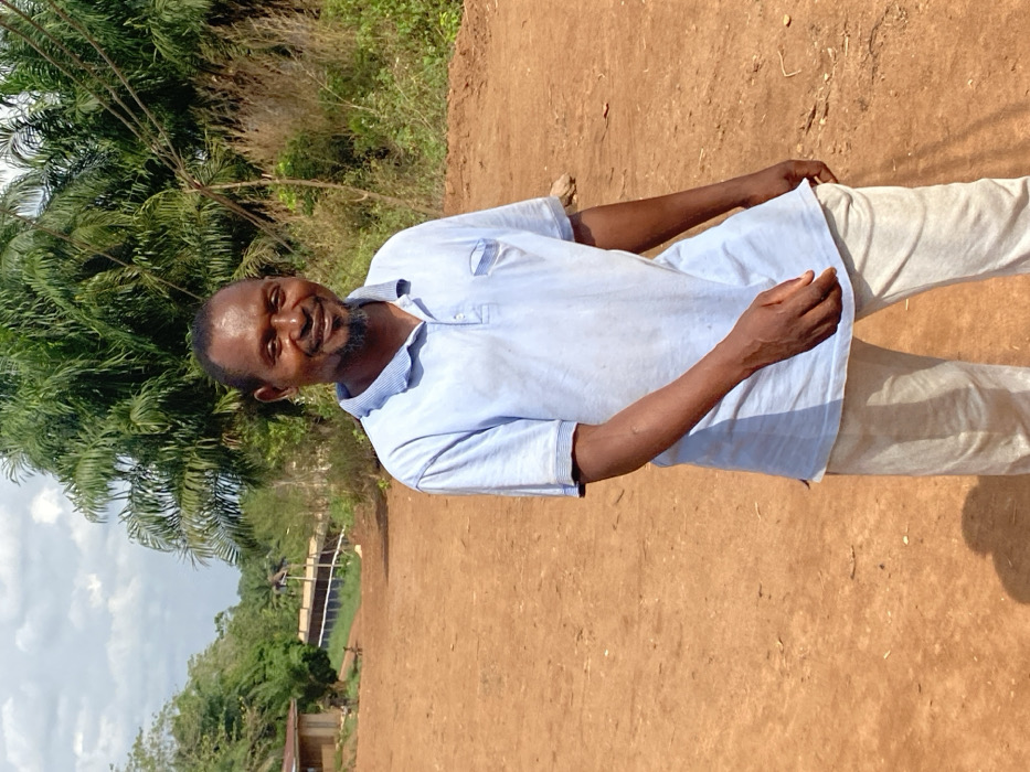 An adult male of African descent stands smiling on a reddish-brown dirt path in Achara, Nigeria
