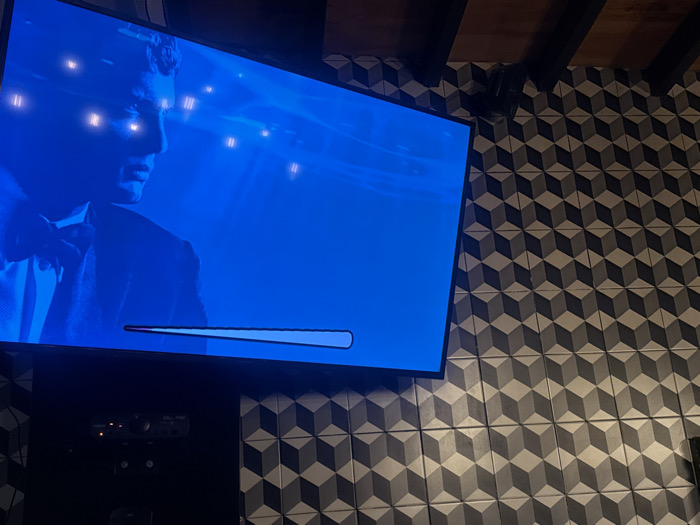The image captures an interior scene within a commercial establishment in Irapuato, Mexico. A large, wall-mounted television screen occupies the left side of the frame, displaying a male figure in profile, facing right. The figure is depicted wearing a dark suit jacket and a bow tie against a predominantly blue background accented with multiple scattered bright white points of light. A horizontal progress bar, partially filled with a lighter blue segment, is visible at the bottom of the screen. Below the television, a dark panel or cabinet houses electronic equipment, including a device with illuminated indicator lights (red, orange, green) and a rotary dial. The wall to the right and beneath the television features a repeating geometric pattern of three-dimensional cubes in varying shades of dark grey and light grey. Dark wooden beams, consistent with ceiling infrastructure, are visible in the upper right quadrant. No individuals are physically present within the depicted scene.