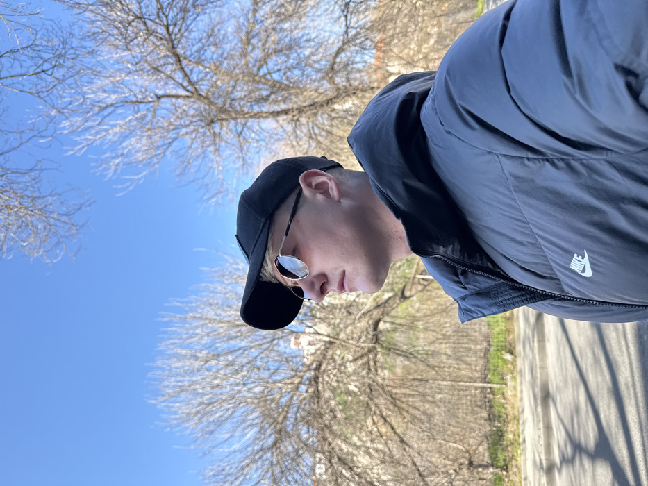 A young adult male is depicted in a profile shot, facing towards the right side of the frame, looking slightly upwards. He wears a black baseball cap, round mirrored sunglasses with light-colored frames, and a dark blue or grey puffer jacket featuring a light-colored Nike logo on the left chest. His skin tone is light, and short hair is visible beneath the cap. The background consists of numerous bare deciduous trees, indicating a late winter or early spring season. A clear blue sky occupies the upper portion of the image. Faint light-colored building structures are partially visible in the distance behind the trees. A paved surface, possibly a road or sidewalk, is visible in the lower left, exhibiting shadows consistent with direct sunlight. The scene is outdoors, on a sunny day in the city of Plovdiv, Bulgaria.
