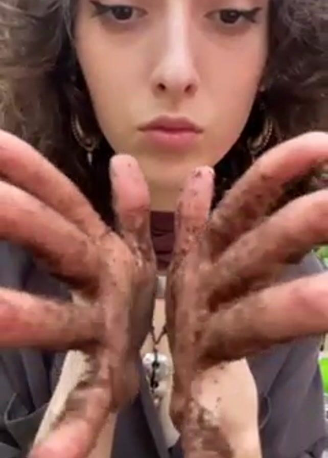 A woman with curly brown hair and eyeliner looks at the camera, holding up her hands covered in dirt