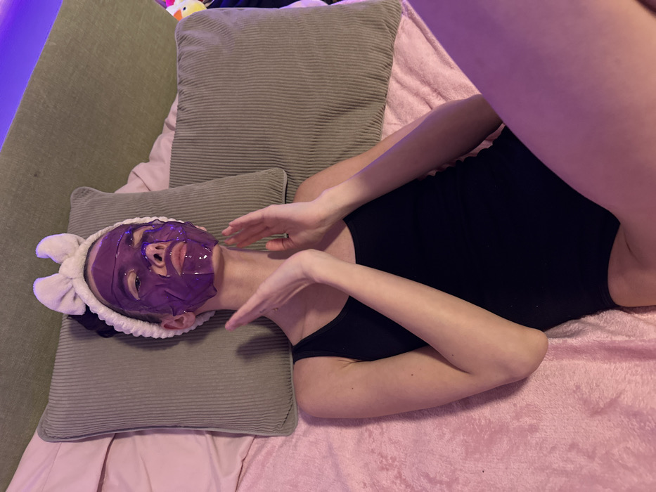 A single individual is depicted lying supine on a bed within a private residence in Corby, United Kingdom. The individual, appearing to be a young adult, has a translucent purple sheet mask applied to their face, which covers the forehead, nose, cheeks, and chin. A white, fluffy, bow-shaped headband secures the hair away from the face. The individual wears a black tank top or bodysuit. Both hands are raised, positioned near the head and neck, with palms facing inward and fingers slightly splayed. A faint gold-colored necklace is visible on the neck. The individual's eyes are open and directed towards the camera. The bed is covered with a pink, textured blanket. Two large, rectangular, ribbed light-green pillows are positioned behind the individual's head and upper back. A green headboard is partially visible at the top of the frame. A small, multicolored object, possibly a plush toy, is visible on the far right edge of the image. The scene is illuminated by artificial light, with a distinct magenta or purple hue cast on the lower right portion of the image.