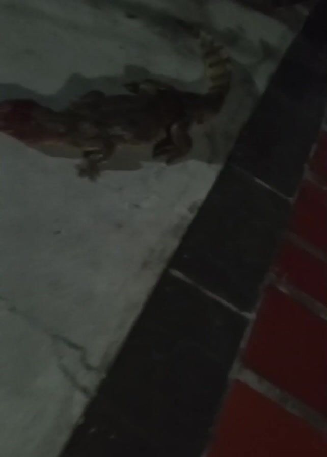 small crocodile lying on a concrete surface next to a brick wall. It’s dark and the lighting is poor. The crocodile is facing left, and its tail has some lighter stripes. There's the sound of people talking in the background.
