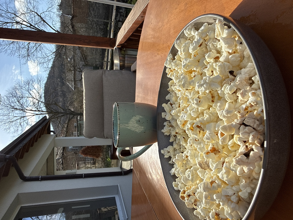This image depicts an outdoor leisure setting on a sunny day in Kipra, Bulgaria. In the foreground, a large, dark gray bowl filled with popcorn occupies the lower center of a light brown wooden table. To the left and slightly behind the popcorn, a teal-colored ceramic mug is placed on the same table. Directly behind the mug, a light-colored padded outdoor chair is visible, facing away from the viewer. The background on the left side features a white building facade with a prominent brown gutter. Further back, a small, conical reddish-brown shrub is visible in a landscaped area. On the right, a dark wooden railing or pergola support beam extends vertically. The mid-ground and distant background consist of bare deciduous trees against a bright blue sky with sparse clouds. Various traditional-style buildings with stone walls and rooftops are discernible through the trees, with hills or mountains forming the distant horizon. No individuals are present in the scene.