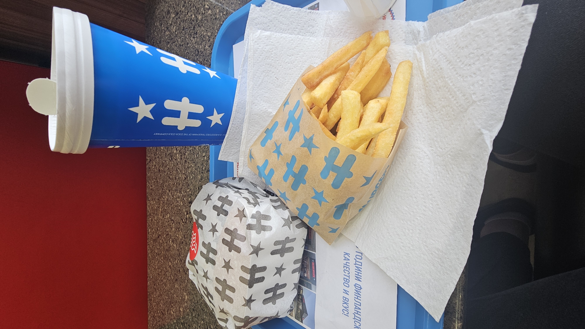 A top-down shot reveals a fast-food meal placed on a blue tray. The meal consists of a blue cup with white accents, a hamburger wrapped in paper with black and white designs, and a paper container of french fries. A white paper napkin surrounds the french fries. Underneath the paper napkin is a pamphlet containing the text "ГОДИНИ ФИНЛАНДСК КАЧЕСТВО И ВКУС!" and "HESBURGER." The phrase "IS A REGISTERED TRADEMARK OF THE COCA-COLA COMPANY" is also visible on the cup. A portion of the person's legs dressed in black is visible on the right. A red surface is seen on the left. The image does not indicate the meal is in Shtarkovo, Bulgaria.