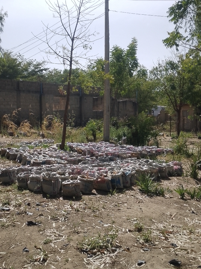 The scene depicts an outdoor, unpaved area in Dabawa, Nigeria, under a clear sky. In the foreground and mid-ground, a large collection of approximately 150-200 open, light-colored woven bags, resembling sandbags or feed sacks, are neatly arranged in multiple rows on barren dirt ground. These bags appear to contain various lighter materials or refuse, with some exhibiting colorful linings or contents. A slender, leafless tree stands centrally among the bags. The ground is sparse, showing patches of dry leaves, small green weeds, and a few aloe-like plants. In the background, a low-rise, rough-textured concrete or mud wall spans horizontally, partially obscured by dense green foliage. Behind this wall, additional smaller, dilapidated structures with open window apertures are visible, along with further trees. To the far right, a small, light-colored building with a dark-colored door is present. A wooden utility pole with overhead wires rises vertically on the right side of the image, extending into the clear sky. No individuals or active interactions are visible.