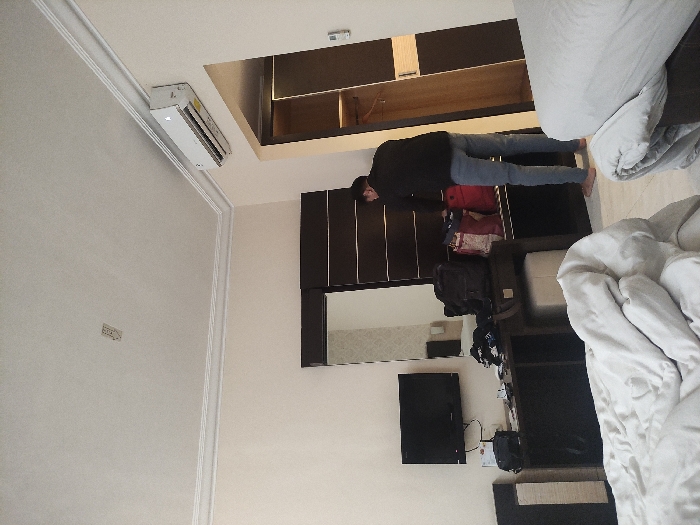 hotel room in Jember, Indonesia. A man in blue jeans and a black shirt is standing in front of a closet, facing a wall with a flat-screen television mounted on it. He is looking down at a bag lying on the floor next to the closet. There is a bed with white sheets and a pillow in the right corner of the image. The room is mostly white with beige walls, and a white air conditioning unit mounted on the ceiling. There are dark brown wood floors. A dark brown wooden nightstand with a lamp and a small shelf is visible to the left of the bed. There is a mirror on the right side of the closet. The man is in the process of packing or unpacking. The room is well-lit. The coordinates provided, -8.172, 113.698, do not provide a specific location within the city of Jember, Indonesia.