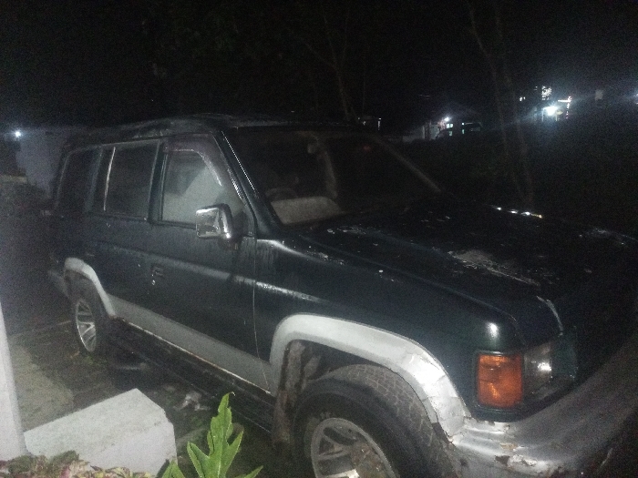 A dark green multi-purpose vehicle, possibly an SUV or older station wagon model, is parked outdoors at night in Ciherang, Indonesia