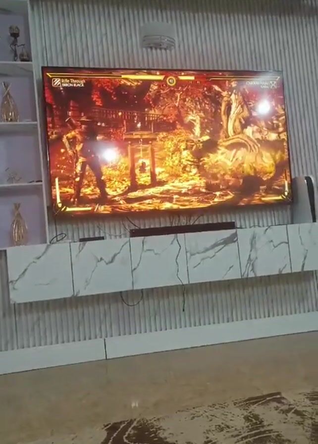 A person is playing a video game on a large screen TV. The TV is mounted on a wall with a decorative white marble-patterned console beneath. The game appears to be a fighting game with a fiery background. The person is sitting on a chair, holding a white PlayStation controller. They are wearing a maroon and white track jacket and jeans with a circular red patch on the back pocket. A can of beer is on the floor beside them. The room has a white paneled wall with built-in shelving, and a patterned floor.