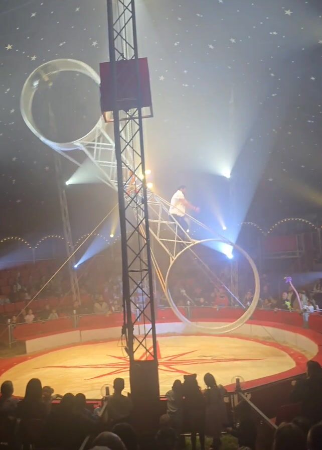 Inside a circus tent, a man performs on a rotating apparatus. He stands on a circular wheel, part of a tall metal structure, while spotlight beams illuminate him. The audience sits around the central ring, watching the performance. The tent's ceiling is dark, adorned with star-shaped lights.