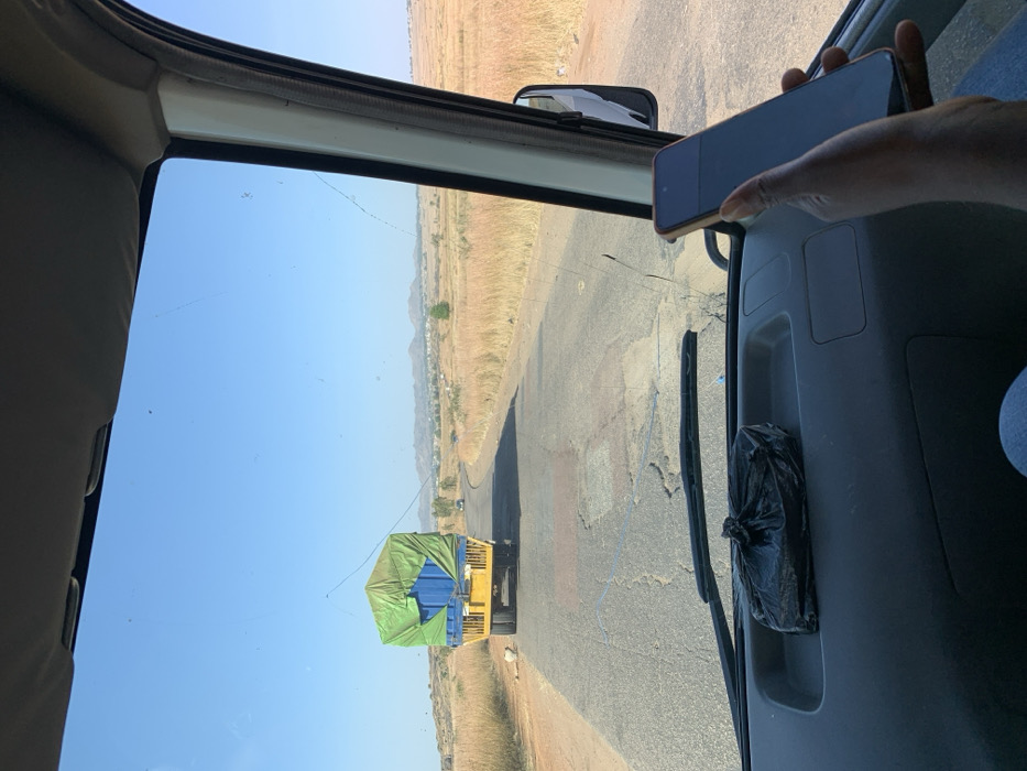 The image depicts a rural road scene in Kuru Dungus, Nigeria, captured from the interior of a moving vehicle through a cracked and dirty windshield. In the foreground, a dark-skinned human hand holds a dark-screened smartphone vertically on the right side of the frame. Below the hand, a portion of blue fabric from an article of clothing is visible. Centered on the dark-colored dashboard, a black plastic bag, tied at its top, rests in a recessed compartment. The vehicle's white A-pillar and a portion of the side mirror are visible on the right. Beyond the windshield, a damaged asphalt road with numerous cracks and potholes extends into the mid-ground, where a large truck with a blue chassis and a bright green tarp covering its cargo drives away from the viewer. The truck's rear wheels are yellow. Further down the road, a smaller, dark-colored vehicle is visible. The immediate environment on both sides of the road consists of dry, golden-brown grasses and sparse vegetation under a clear, cloudless blue sky. In the far distance, a range of low hills or mountains is visible on the horizon, with a scattered settlement appearing below them.