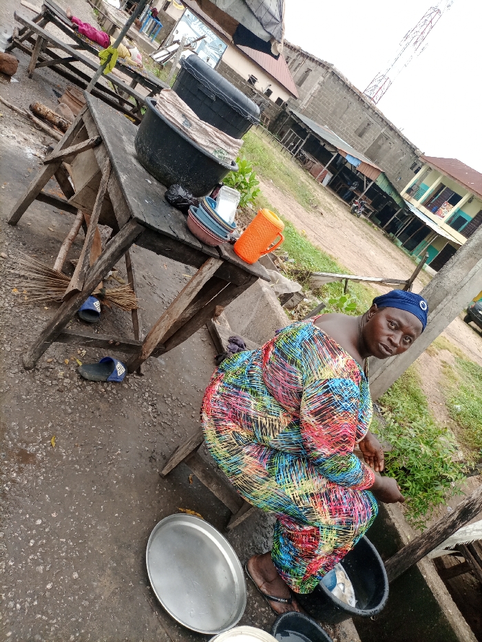 The image depicts an outdoor scene in the city of Zango-ndaji, Nigeria, featuring a woman beside a vendor stall. A woman, appearing middle-aged, with medium complexion, wears a multicolored long-sleeved dress with a vibrant, scribble-like pattern and a blue headwrap. She is seen from the waist up, squatting or sitting on a low wooden stool, looking directly at the camera with a neutral expression. Her right hand rests in her lap, and she wears dark flip-flops. To her left, a rustic wooden table serves as a stall, holding two black plastic tubs (one larger, one smaller with a light cloth draped over it), a black plastic bag, a stack of multi-colored plastic bowls, a clear plastic container, and an orange plastic jug with a yellow lid. Beneath this table, a broom made of natural fibers and a pair of blue slides are visible on the ground. At the woman's feet, a large, round silver metal tray and a black plastic bucket are present, with a white bucket partially visible. The ground is uneven, appearing wet and composed of dirt or worn concrete. Sparse green vegetation grows around the immediate area. In the background, various buildings are visible under an overcast sky: a multi-story grey concrete structure, a row of single-story market stalls with corrugated metal roofs, and a two-story building with a lighter facade. A tall communication tower rises prominently against the sky in the far background. The scene suggests a typical street or market setting.