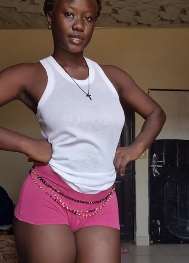 A young, dark-skinned woman is standing indoors, wearing a white tank top and pink shorts with a beaded chain belt