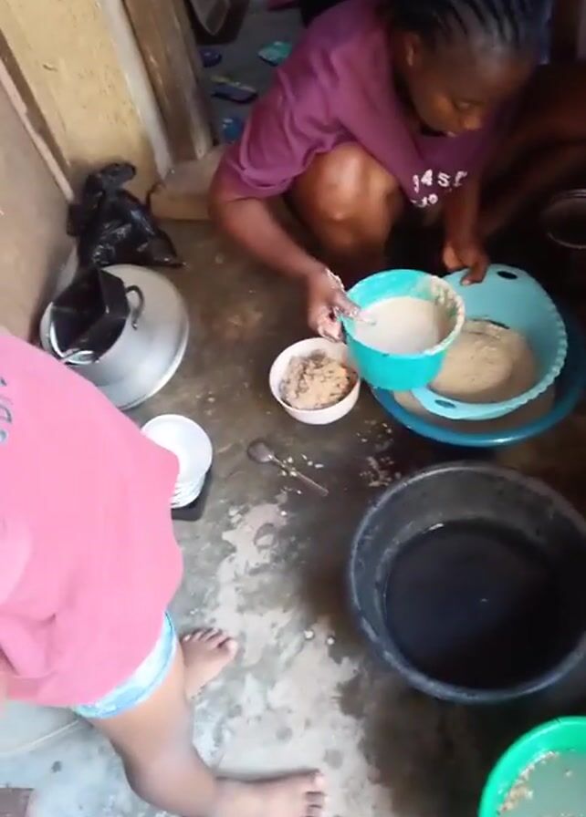 A woman squats on a tiled floor in a small room and is using a blue colander to sift what appears to be grainy mixture into a larger blue bowl. Near the woman, there are two black tubs, a green tub, a small white bowl, a silver spoon, and a bunch of bananas. In the background, a white blender is visible and a small cluttered area. A person stands to the left of the woman.
