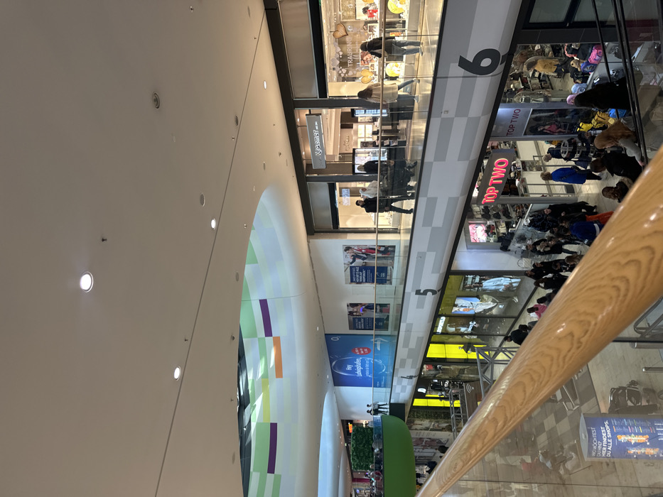 interior of a shopping mall located in Ludwigshafen am Rhein, Germany. The scene is captured from a lower level, looking upwards towards a higher level. The higher level has multiple stores and shops, including a jewelry store called "Juwelier..." and a shoe store called "Top Two". There are people walking and shopping on the higher level. Some of them are entering and exiting stores. The lower level appears to be a food court or a similar public area. The mall features a white ceiling with multiple recessed lights. The walls are painted in a light shade of beige. The floor is made of beige tiles. There is a large wooden handrail, likely for an escalator, running from the bottom left to the top right of the image. There is a large sign on the wall on the higher level, which is in German. It is not clear what the sign says. A large portion of the upper level is a glass railing, which allows for natural light to enter the space. The scene is busy with people shopping and browsing. The image captures the typical hustle and bustle of a large shopping mall.