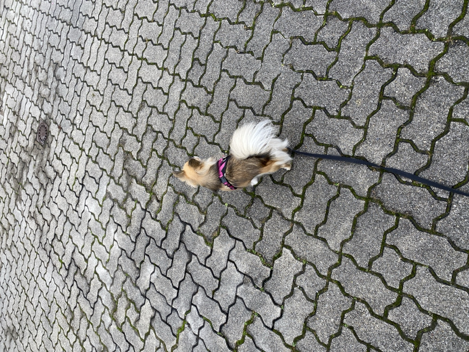 A small, long-haired dog, predominantly light brown and tan with a cream-colored fluffy tail, stands on an interlocking gray concrete paver surface