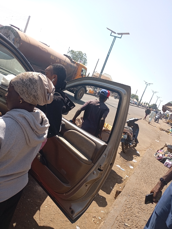 An outdoor street scene in Gombe, Nigeria, captured during daylight. The foreground features a light-colored sedan with its front passenger door fully open, parked on a dusty reddish-brown unpaved shoulder next to a paved road. Three individuals are prominent around the car: 1. A woman on the left, wearing a light beige headscarf and a light grey hooded sweatshirt, facing towards the right. 2. A second woman, positioned behind the first and in front of the open car door, is seen from the back. She has dark braided hair and wears a dark top. She appears to be leaning into the vehicle. 3. Reflected in the car's open door is a man wearing a dark shirt and a blue and red baseball cap, facing away from the camera, seemingly bent over and interacting with items (possibly yellow bags of goods) on the ground or within the car's footwell. In the midground, a large brown water tanker truck with "WATER TANK" inscribed on its side is visible on the paved road, moving or stationary. Multiple tall streetlights equipped with rectangular solar panels extend upwards against a clear, bright sky. Further down the road, additional pedestrians and at least one motorcycle are discernible. On the unpaved shoulder to the right, a vendor's display of various footwear, including pink sandals, is set up. Scattered white plastic bags or debris are present on the ground near the open car door. In the bottom right corner, a person's hand, adorned with a dark beaded bracelet, holds a black smartphone, situated beside a concrete curb. The overall environment is bright, suggesting a sunny day in an urban setting with a mix of paved and unpaved surfaces.