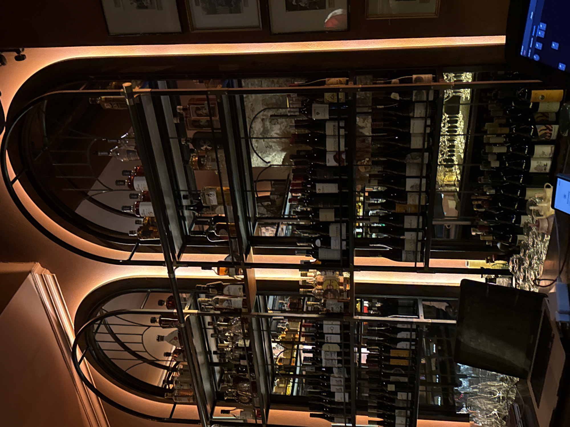 n illuminated bar shelf in what appears to be a restaurant or bar. The shelf is metal and arched, featuring two main tiers with multiple shelves within each. It displays an assortment of liquor and wine bottles. Behind the bottles, there's a wall, and there are glasses on the counter to the right. A laptop is open on the right side of the image, partially obstructing the view of the lower tier of the shelves. The location of the scene is undetermined.