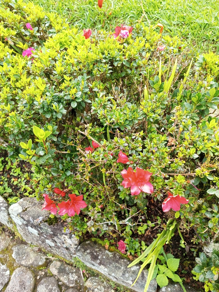 A vibrant azalea bush flourishes with bright green leaves and striking red-pink blossoms. The flowers range from fully open to buds, clustered amidst the foliage. A stone wall provides a lower border, partially covered with moss and small plants. Blades of grass and other greenery fill the background, creating a natural, colorful scene.