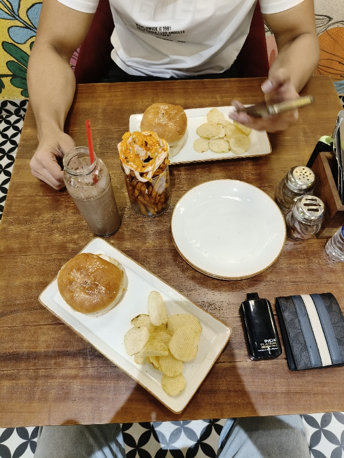 The image depicts an overhead view of a wooden table in a cafe or restaurant in Kolkata, India, occupied by an individual. The individual, visible from the upper torso, wears a white t-shirt with dark text and has their forearms resting on the table. Their left hand is positioned near a clear glass bottle containing a chocolate milkshake with a red straw. Their right hand holds a gold-colored smartphone. On the table, there are multiple food items and personal belongings. Two rectangular white plates, each containing a burger on a sesame seed bun and a portion of plain ruffled potato chips, are present. A clear glass tumbler filled with seasoned french fries or similar fried potato sticks, topped with a white sauce and orange seasoning, is centrally located. An empty round white plate with a brown rim is also on the table. To the right, a pair of chrome-capped shakers, presumably for salt and pepper, stand next to a small clear plastic bottle. Personal items on the table include a black electronic device, identified by "INOX PLATINUM" text, and a bi-fold wallet featuring dark grey, light blue, and white stripes. The immediate environment includes a section of black and white geometric patterned floor tiles visible at the bottom and a colorful, abstract patterned wall or upholstery behind the seated individual.