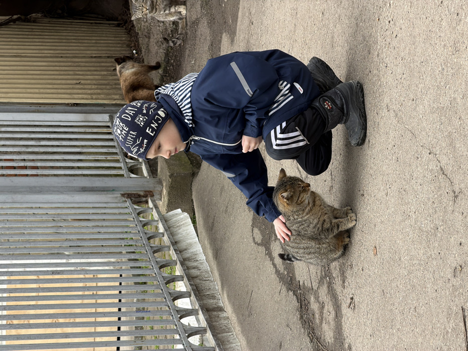 In Beryozovy, Russia, a young boy is observed crouching on a grey concrete surface outdoors. He wears a dark blue winter jacket with a striped hood lining, black pants with white vertical stripes, a dark beanie with white text and a crocodile emblem, and dark winter boots. His right hand is resting on the head and upper back of a sitting, short-haired tabby cat, which has its eyes closed. In the background, a grey metal fence with vertical bars and arched base elements separates the foreground from a building with a light-colored facade. Near the fence, a brown/tan cat walks away from left to right, and another tabby cat sits looking left. The ground in the background also features scattered debris.
