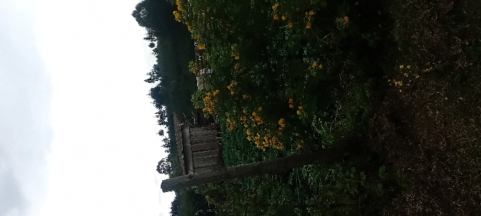 This image displays an outdoor scene in Kinale ward, Kenya, under an overcast sky. The foreground shows dark earth with sparse ground cover. A single, weathered, vertical wooden post is positioned on the left. The mid-ground is characterized by dense green foliage, featuring several shrubs with clusters of small yellow flowers. Behind this vegetation, a cultivated plot of low-lying green plants, consistent with crops, is visible. In the upper mid-ground, a rustic, elevated wooden structure, possibly a shed or outbuilding, stands with vertical plank siding and a dark, gently sloped roof. The background consists of a dense treeline or forest, appearing as a dark green mass beneath the lighter, cloudy sky. No individuals, animals, or explicit actions are present within the frame.
