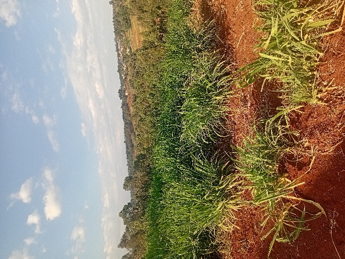 A field of young green crops stretches towards the horizon under a partially cloudy blue sky. Rich, red-brown soil is visible between the rows of plants, which appear to be grasses or cereal crops. A line of trees and distant fields create a blurred background. The image is slightly rotated, giving a dynamic, off-kilter perspective of the rural landscape.