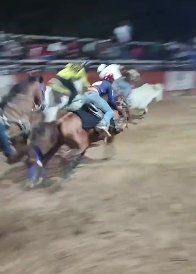 late night horse race at an outdoor arena. Several horses with riders race across a dirt track, illuminated by overhead lights. Spectators are seated in stands along the perimeter. The camera pans to follow the action as the horses move away from the starting area.