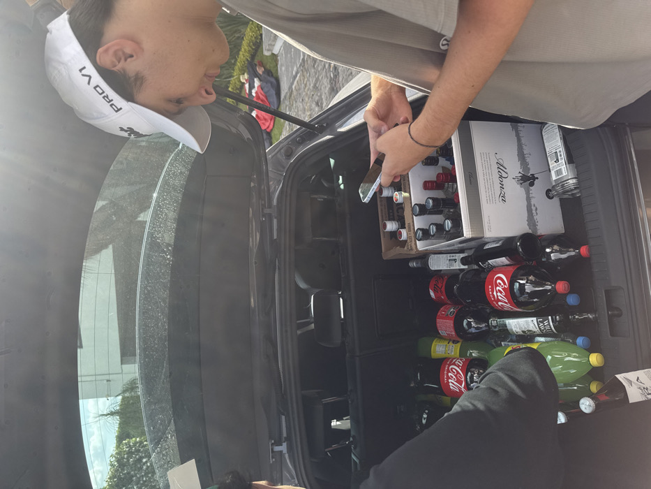 A man in a cap holds a phone over the trunk of a car, open and filled with beverages. There is a case of wine on top, followed by bottles of Coca-Cola, Wild Leap vodka lemonade, and other unlabeled bottles. He seems to be photographing or filming the car's contents.